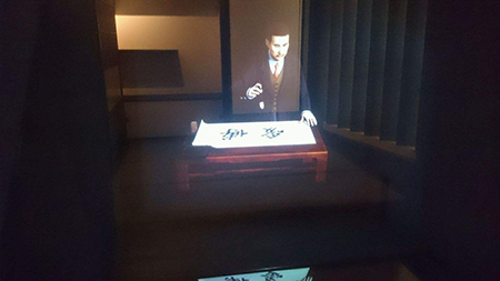 觀眾看到墻面上多個顯示設(shè)備中,每個顯示畫面中都有人物的視頻靜止影像。每臺電視下都有一個控制按鈕(可以是自動感應(yīng)器),當觀眾按到其中一個時(當自動感應(yīng)器撲捉有人接近 ……